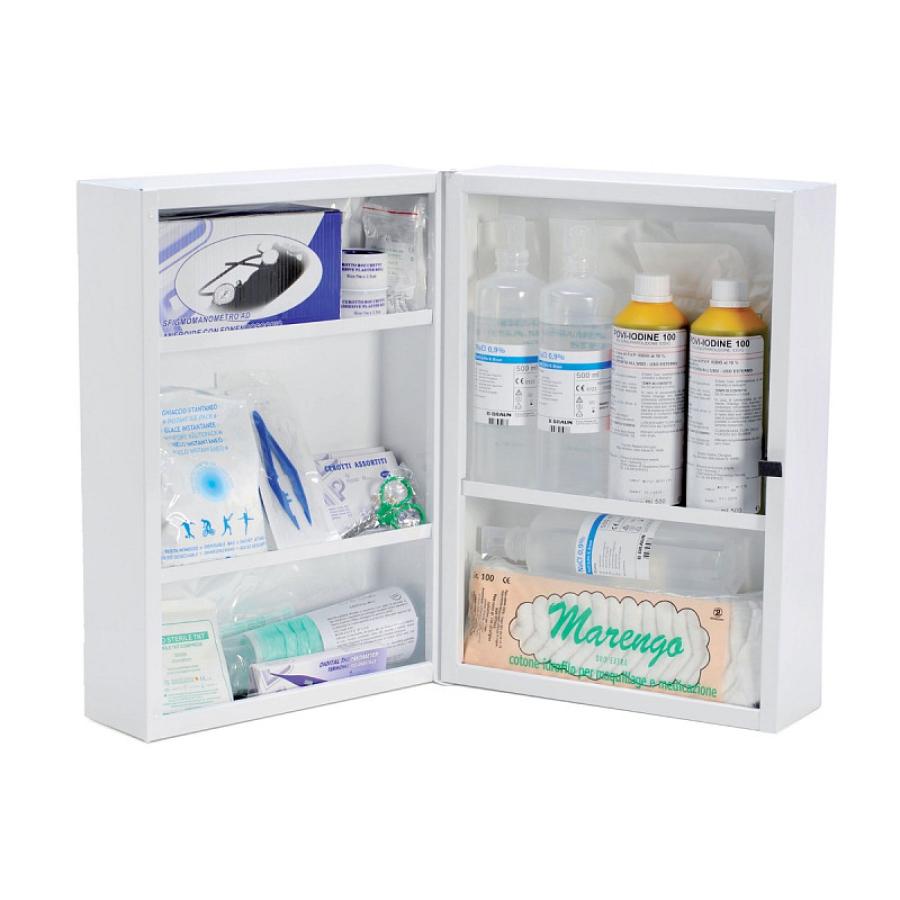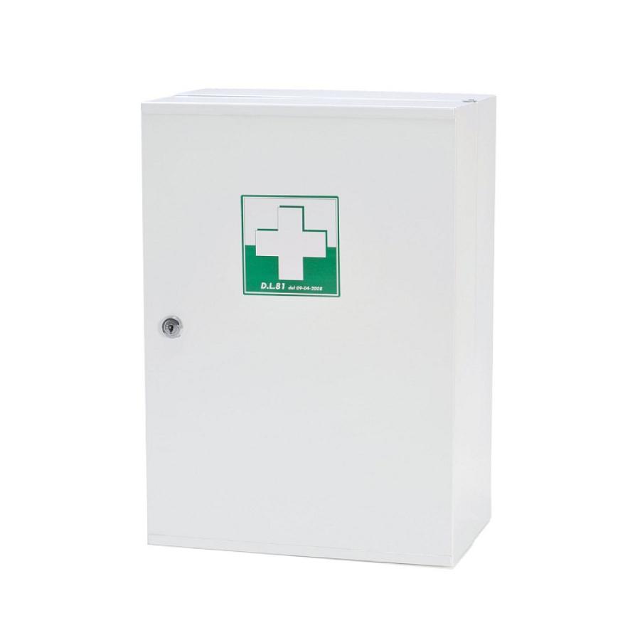 Armadietto in metallo verniciato con polvere epossidica colore bianco, anta portante,3 ripiani , 5 vani, serratura con chiave. Contenuto conforme al D.Lgs. n. 81/2008 – All. 1 D.M. 388/2003 Gruppi AB per aziende o unità produttive con tre o più lavoratori.