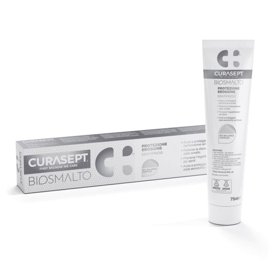 Biosmalto Dentifricio Protezione Erosione 75 ml Curasept è un dentifricio ad alta tecnologia formulato per offrire una protezione specifica contro l' erosione acida dello smalto dentale. Indicato per pazienti adulti, è particolarmente utile in caso di denti sensibili o soggetti a demineralizzazione, contribuendo a mantenere la salute orale nel tempo.La sua efficacia si basa sull' innovativo BIO-BALANCE COMPLEX, una combinazione sinergica di Tampone Fosfato e Carnosina, che aiuta a stabilizzare il pH del cavo orale e a contrastare l' azione erosiva degli acidi. Questo complesso avanzato rallenta la dissoluzione dello smalto e contribuisce a prevenire l' ingiallimento dei denti, mantenendo il sorriso più sano e luminoso.La formulazione contiene 1450 ppm di fluoro, un elemento essenziale per il rafforzamento dello smalto, e presenta un indice di abrasività RDA <30, che garantisce una pulizia efficace ma delicata, adatta anche all' uso quotidiano. L' azione remineralizzante aiuta a rinforzare la struttura dentale e a ridurre la sensibilità dentinale, migliorando il comfort orale durante la giornata.Per un trattamento completo e duraturo, si consiglia l' utilizzo in abbinamento al collutorio in mousse della stessa linea, potenziando l' effetto protettivo contro l' erosione acida.Formato: 75 mlTipologia: pasta dentifriciaIndicato per: denti sensibili, erosione acida, demineralizzazione