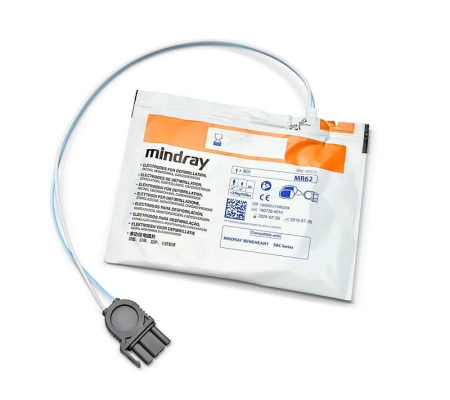 Gli elettrodi per adulti del Mindray BeneHeart serie C sono adatti anche per l'uso pediatrico grazie al selettore pediatrico presente sul DAE. Gli elettrodi possono essere preconnessi al defibrillatore già prima dell'emergenza per risparmiare tempo. Le piastre sono facilmente sostituibili. Basta estrarre lo spinotto e inserire quello nuovo. Il DAE ha un comodo vano per posizionare gli elettrodi.Durata delle placche MR62