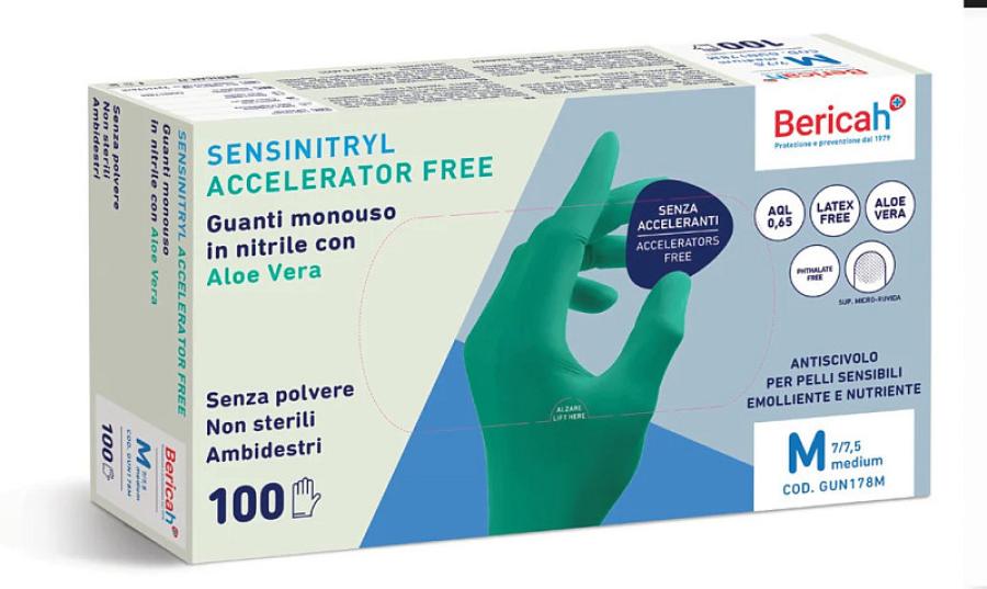 Guanti in nitrile Sensinitryl Accelerator Free Bericah, ideali per l' uso in ambito sanitario e ospedaliero, sono progettati per garantire la massima protezione e comfort anche durante utilizzi prolungati. Realizzati in nitrile di alta qualità , sono privi di lattice, ftalati e agenti acceleranti, riducendo significativamente il rischio di reazioni allergiche, rossori o screpolature cutanee.Grazie alla formulazione con Aloe Vera, come indicato nella documentazione tecnica, offrono un' azione lenitiva e idratante sulla pelle, rendendoli particolarmente indicati per operatori sanitari con pelle sensibile o soggetta a irritazioni.Di colore verde, ambidestri e dotati di polsino salvastrappo, assicurano una calzata sicura e una maggiore resistenza durante l' uso. La texture superficiale garantisce un' eccellente sensibilità tattile e una presa ottimizzata, anche in presenza di liquidi o strumenti medicali.Questi guanti sono monouso, non sterili e senza polvere, ideali per reparti ospedalieri, ambulatori e laboratori. Offrono una comprovata resistenza chimica a disinfettanti, detergenti e detersivi, come riportato nei test tecnici disponibili nella documentazione ufficiale.Ogni confezione contiene 100 pezzi.Classificati come Dispositivo di Protezione Individuale (DPI) di III categoria secondo il Regolamento (UE) 2016/425 e come Dispositivo Medico (DM) di classe I ai sensi del Regolamento (UE) 2017/745, i guanti Sensinitryl Accelerator Free sono conformi anche alla normativa per il contatto con alimenti: Reg. (UE) 1935/2004/CE e Decreto Ministeriale 21.03.1973 s.m.i.Una scelta professionale per chi cerca sicurezza, comfort e protezione dermatologica senza compromessi.