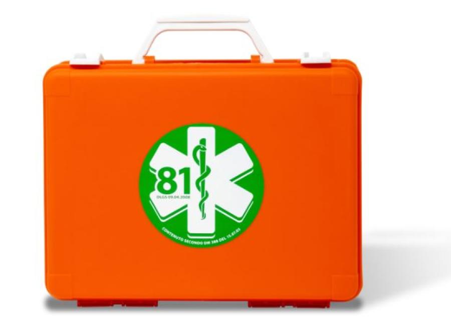 Valigetta realizzata in polipropilene antiurto, colore arancio, supporto per attacco a parete, maniglia per trasporto, chiusura con 2 clip rotanti.Contenuto a norma del DM 388 del 15/07/2003 allegato 2 e D.L. 81 del 09/04/08 art.45. per aziende o unità produttive con meno di tre lavoratori che non rientrano nel gruppo A . L'art.2 punto 5 del DM 388 del 15.7.2003 prevede che il contenuto di cui all'allegato 2 deve essere fornito ai lavoratori che operano in luoghi diversi dalla sede aziendale o unità produttiva.Contenuto: