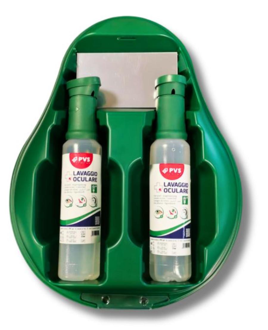MINI DROP è una soluzione compatta per il lavaggio oculare, ideale per ambienti con rischio di polveri o schizzi chimici leggeri. Il set comprende due flaconi di soluzione salina sterile monouso da 250 ml, dotati di un tappo oculare per un utilizzo immediato. La stazione è progettata per un montaggio a parete semplice e sicuro, grazie al supporto termoformato con chiusura antipolvere e specchietto integrato per facilitare il controllo visivo durante l'uso.Caratteristiche tecniche: