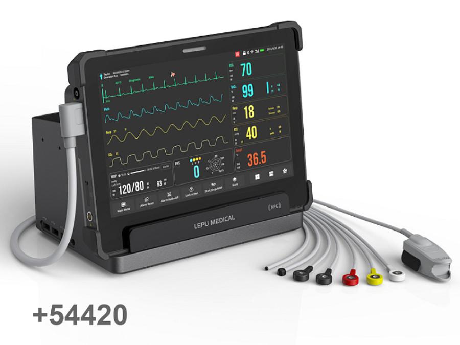 - Struttura con accessori: cavo per 4/5 derivazioni ECG, sensori SpO2 e TEMP
