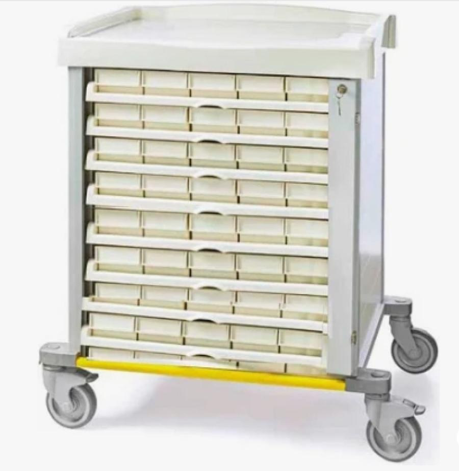 di Medi Carr è la soluzione ideale per l'organizzazione e la distribuzione sicura dei farmaci in ambienti sanitari professionali. Progettato per garantire efficienza, igiene e praticità, questo carrello rappresenta un supporto indispensabile per ospedali, cliniche e strutture assistenziali. La struttura portante è realizzata in tubolari verniciati a polveri, con piantoni frontali, fianchi e retro in alluminio verniciato, assicurando robustezza e resistenza alla corrosione. Le linee arrotondate e il design ergonomico migliorano la sicurezza durante l'uso quotidiano, riducendo il rischio di urti accidentali. Il vano frontale è attrezzato con 50 cassettini e 1 cassetto grande alla base, tutti in materiale plastico stampato con bordi smussati e maniglie integrate, per una gestione ordinata e intuitiva dei farmaci. I vassoi scorrevoli sono montati su guide ad estrazione totale, facilitando l'accesso e il riordino del contenuto. Il fianco sinistro è dotato di un piano supplementare estraibile, utile come superficie di appoggio temporanea durante le operazioni di somministrazione. Il top superiore, in materiale plastico termoformato con bordo di contenimento su tre lati, è facilmente lavabile e predisposto per l'inserimento di accessori opzionali. Il basamento è equipaggiato con paracolpi laterali e 4 ruote da 125 mm, di cui 2 con freno e 2 girevoli, per una manovrabilità fluida e sicura anche in spazi ristretti. Con dimensioni di 800x600x1300 mm, questo carrello offre una capacità di stoccaggio ottimale in un ingombro contenuto, rispondendo alle esigenze logistiche delle strutture sanitarie moderne. Affidabilità, funzionalità e igiene: il Carrello Farmaci 1550 Medi Carr è un alleato prezioso per il personale sanitario.