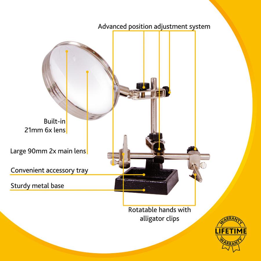 La lente d'ingrandimento Levenhuk Zeno Refit ZF15 è adatta per le riparazioni di orologi e gioielli, la lavorazione di componenti elettronici, la saldatura o la pittura di qualsiasi dettaglio. Questa lente d'ingrandimento può essere usata dagli appassionati come dai professionisti. Grazie al suo design, questa lente da tavolo è molto pratica: consente di avere le mani libere per eseguire lavori di precisione. La lente è realizzata in vetro polimero ottico e fornisce immagini nitide e dettagliate di qualsiasi oggetto ingrandito. Il suo corpo in metallo resistente assicura stabilità e una lunga vita utile. Tutte le lenti di questa serie sono dotate di terza mano per il supporto di oggetti. Caratteristiche: Lente bifocale realizzata in vetro polimero ottico Doppio ingrandimento: 2x e 6x Due supporti con morsetti Vassoio per accessori Base con contrappeso MarchioLevenhuk Inc., USAGaranziaa vitaEAN5905555006154Dimensione confezione (LxPxH)18x9x7 cmPeso spedizione0.58 kgTipo di lentebifocaleMateriale delle ottichevetro polimero otticoDiametro lente (dimensioni), mm90Diametro lente aggiuntiva, mm21Range diametrioltre i 90 mmIngrandimento, x2 — 6Ingrandimento, x2Ingrandimento lente aggiuntiva, x6CorpometalloApplicazionecucito/tessuto, riparazione orologi/gioielleriaDesignpiano di appoggio/su treppiede