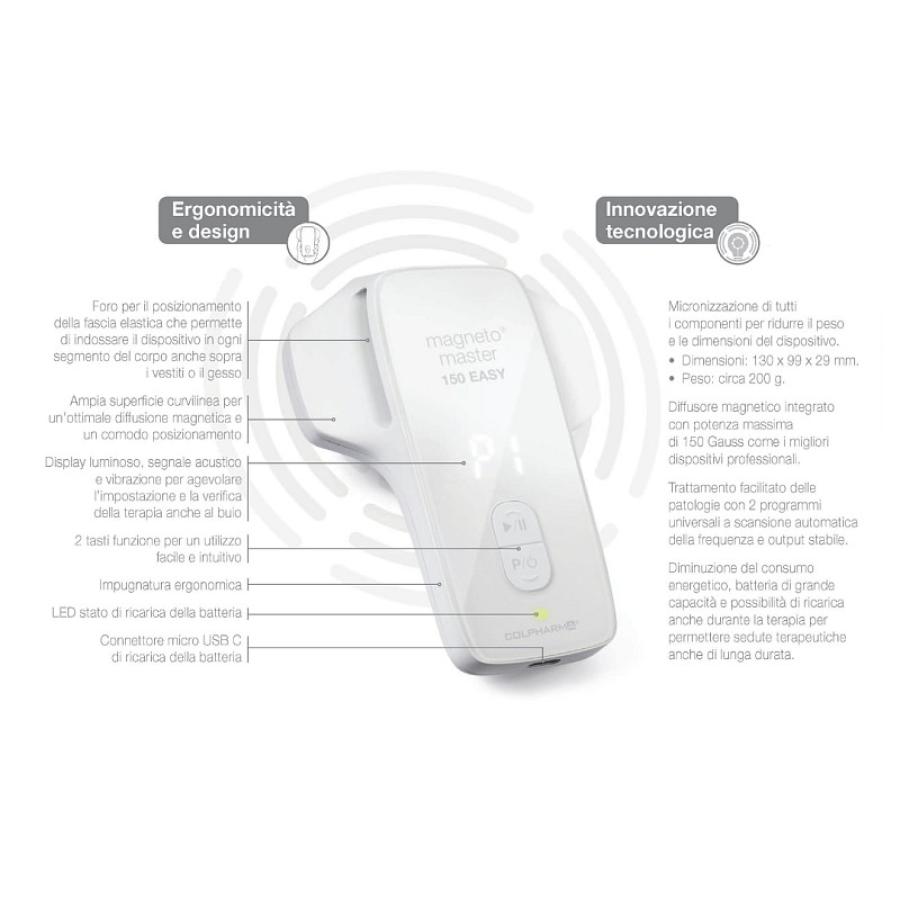 Il Magneto Master 150 EASY è un dispositivo portatile per magnetoterapia, progettato per l'uso domiciliare. Utilizza Campi Elettromagnetici Pulsati (PEMF o CEMP) per offrire trattamenti efficaci. Grazie al suo design compatto e leggero, può essere facilmente indossato sopra vestiti e gessi. Alimentato da batterie ricaricabili di lunga durata, consente trattamenti in totale libertà e in qualsiasi situazione.Caratteristiche tecniche: