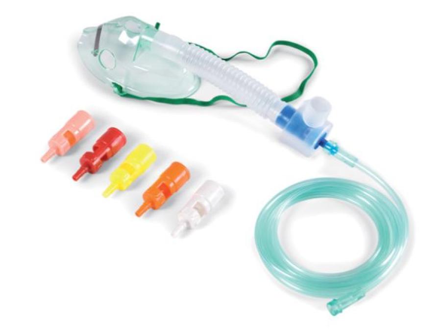 Maschera morbida a concentrazione variabile con sistema Venturi - AdultiComplete di 6 raccordi colorati e tubo di collegamento antischiacciamento.