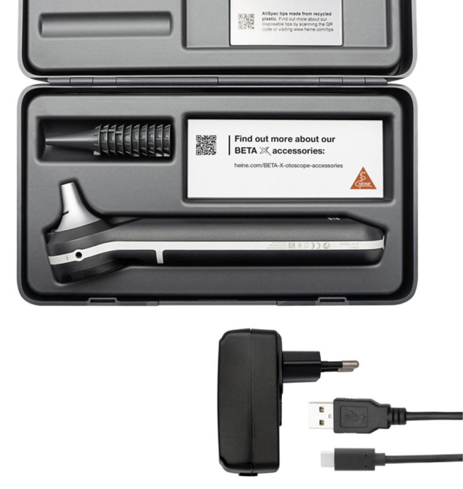 - durata estesa della batteria e vita utile virtualmente illimitata di LEDHQFornito con HEINE X CHANGE System 4.2x Magnifier, 10 speculum monouso AllSpec 4 mm, cavo di alimentazione USBC, astuccio rigido e manuale multilingue GB, FR, IT, ES, PT, DE, NL, SE, DK, NO, FI.