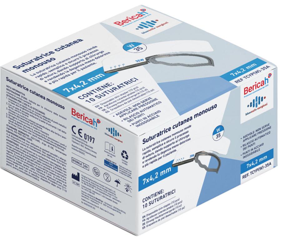 Suturatrice Cutanea Monouso con punto 6,5x4 mm - 10 pz. di Bericah è un dispositivo medico monouso progettato per la chiusura efficiente, rapida e sicura delle incisioni cutanee in ambito chirurgico. Prodotta da Bluesail Surgical e distribuita da Bericah, rappresenta una soluzione avanzata per ottimizzare i tempi operatori, ridurre il trauma tissutale e migliorare il comfort post-operatorio del paziente.Il dispositivo è dotato di un meccanismo di rilascio automatico dei punti, che consente l' applicazione della sutura senza esercitare pressione diretta sulla cute. Questa caratteristica riduce il rischio di danni ai tessuti, favorisce una guarigione più rapida e contribuisce a minimizzare le complicanze post-chirurgiche.I punti metallici sono realizzati in acciaio inossidabile biocompatibile, materiale che garantisce un' elevata resistenza meccanica, compatibilità con i tessuti e sicurezza d' uso. Il design ergonomico della suturatrice assicura una presa stabile e un utilizzo agevole anche durante interventi prolungati, migliorando la precisione del gesto chirurgico.Caratteristiche principali:Rilascio automatico dei punti per una sutura rapida e precisaNon richiede pressione manuale sulla cute, riducendo il trauma tissutalePunti in acciaio inossidabile biocompatibile, sicuri e resistentiDesign ergonomico per una maneggevolezza ottimaleComposizione del dispositivo:Maniglia superioreManiglia inferiorePunti di suturaCartuccia di punti metalliciPiastra di spinta della pinzatricePiastra premipuntiTelaioDimensioni del punto: TCYP(R)-35(A): 6,5 x 4,0 mm (tolleranza ± 0,5 mm)Classificazione: Dispositivo Medico di Classe IIa conforme alla Direttiva 93/42/EEC, indicato per l' utilizzo in ambienti ospedalieri e chirurgici per la chiusura di incisioni cutanee.Confezione da 10 pezzi, ideale per strutture sanitarie che richiedono dispositivi monouso affidabili, performanti e conformi agli standard di sicurezza europei.